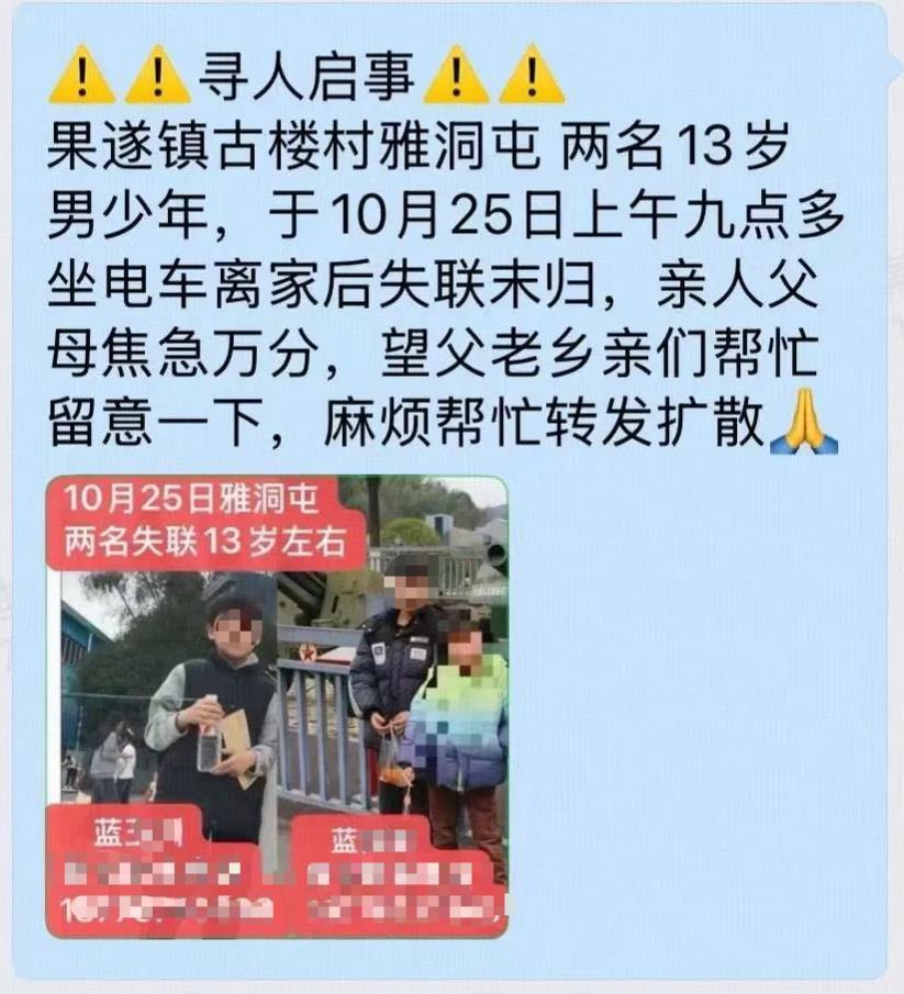 集木讯记者 邓波 10月25日,广西来宾市新城县果绥镇两名13岁男孩失踪,家人发出失踪通知书。 27日,记者获悉,26日下午,救援人员在当地一处灌溉渠中发现了两名男孩的尸体。当地镇政府通报称,符合溺水死亡特征,判定为刑事案件。据家属发布的失踪通知书显示,10月25日上午9点左右,来宾市新城县郭遂镇鼓楼村涌屯的两名13岁男孩乘电瓶车留在家中失踪。希望网友们帮忙提供线索。 10月27日,记者联系上参与救援的亚东村至鼓楼村的一个村庄。他告诉记者了解到,两个孩子均13岁。失去联系后,村民积极帮忙寻找。据了解,两个孩子原本去钓鱼,将电瓶车停在当地一灌溉渠工程的桥上。当他们被发现时,他们的手机和钓鱼竿还没有电池。上述村民还表示,25日晚,当地群众对电瓶车停放处附近的灌溉渠进行了搜查,但没有发现孩子的踪迹。 26日下午,南宁救援队在这条沟里发现了两名儿童的遗体。 “家人都很悲痛。葬礼将于今天(27日)安排。”镇政府通报了情况。据忻城县郭遂镇人民政府此前发布的情况通报:经核实,2025年10月25日9时44分,我镇两名青少年离家后失联。船尾经公安机关侦查,应急、消防、水利、卫生等部门和当地干部群众全力搜查,10月26日16时左右,在国睢镇龙马村北龙屯附近的灌渠中发现两具无生命体征的尸体。家人确认他们就是失踪的青少年。经法医现场勘验,符合溺水卡玛塔的特征,判定为刑事案件。相关开发工作仍在进行中。